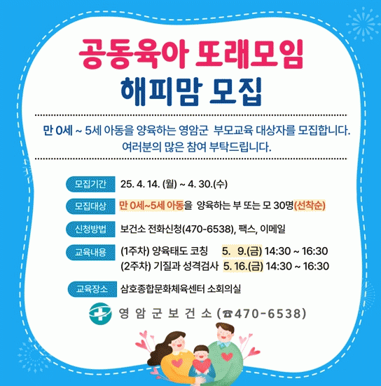 °øµ¿À°¾Æ ¶Ç·¡ ¸ðÀÓ ÇØÇǸ¾¿¡´Â 0~5¼¼ Àڳฦ µÐ ¾ö¸¶³ª ¾Æºü 30¸íÀÌ ¼±Âø¼øÀ¸·Î Âü¿©ÇÒ ¼ö ÀÖ°í, ½ÅûÀº ¿µ¾Ï±ºº¸°Ç¼Ò ÀüÈ·Î ÇÏ¸é µÈ´Ù.