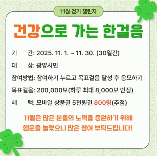 ±¤¾ç½Ã´Â Áö¿ª ÁÖ¹ÎÀÇ °Ç°»ýȰ ½ÇõÀ» µ½±â À§ÇØ 11¿ù 1ÀϺÎÅÍ 30ÀϱîÁö ¸ð¹ÙÀÏ °È±â ¾Û '¿öÅ©¿Â'¿¡¼ ¡®°Ç°À¸·Î °¡´Â ÇѰÉÀ½ 11¿ù °È±â 縰Áö¡¯¸¦ ¿î¿µÇÑ´Ù°í ¹àÇû´Ù.