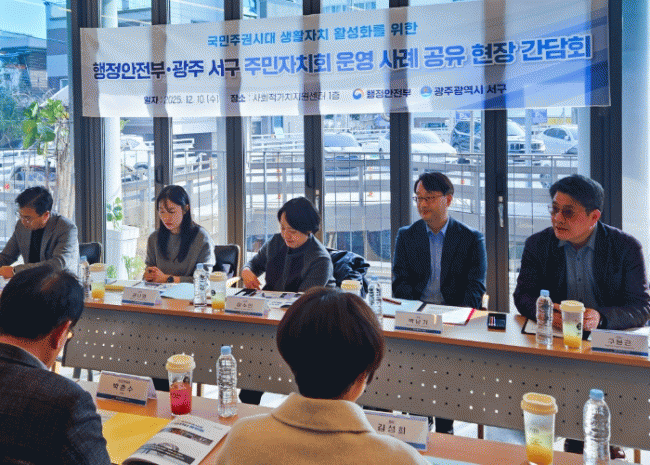 Áö³ 10ÀÏ ÇàÁ¤¾ÈÀüºÎ ±¸º»±Ù ½º¸¶Æ®º¹Áö¾ÈÀü°øµ¿Ã¼ÃßÁø´ÜÀå µî °ü°èÀÚµéÀÌ ¼±¸¸¦ ¹æ¹®ÇØ »ýȰÀÚÄ¡ ±â¹Ý ±¸Ãà°ú Á¦µµÇõ½Å »ç·Ê¸¦ »ìÇÇ°í ´Ù¾çÇÑ ÀǰßÀ» ³ª´³´Ù. ÀÌ ÀÚ¸®¿¡´Â ±Ç¿ªº° °ÅÁ¡µ¿ µ¿Àå 4¸í°ú ÁÖ¹ÎÀÚġȸÀå µîÀÌ Âü¼®ÇØ ¼±¸°¡ óÀ½ ¼±º¸ÀÎ °ÅÁ¡µ¿-¿¬°èµ¿ Çù·Â ½Ã½ºÅÛÀ» ¼Ò°³Çß´Ù.