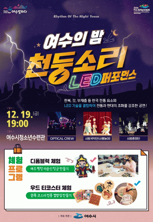 ¿©¼ö½Ã´Â ¿À´Â 19ÀÏ¿¡ ½ÖºÀµ¿¿¡ À§Ä¡ÇÑ ¿©¼ö½Ãû¼Ò³â¼ö·Ã°ü °ø¿¬Àå¿¡¼ ¡®¿©¼öÀÇ ¹ã, õµÕ¼Ò¸®¡¯ 3ȸÂ÷ °ø¿¬À» °³ÃÖÇÑ´Ù.