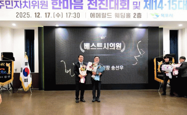 ¸ñÆ÷½ÃÀÇȸ ¼Û¼±¿ì(»êÁ¤¡¤´ë¼º¡¤Á×±³¡¤ºÏÇ×µ¿) °ü±¤°æÁ¦À§¿øÀåÀÌ 17ÀÏ ¿¡¸Þ¶öµå ¿þµùȦ 2Ãþ¿¡¼ ¿¸° Á¦8ȸ ¸ñÆ÷½Ã ÁÖ¹ÎÀÚÄ¡À§¿ø ÇѸ¶À½ ÀüÁø´ëȸ¿¡¼ ¡®¸ñÆ÷½Ã ÁÖ¹ÎÀÚÄ¡À§¿øÈ¸ º£½ºÆ® ½ÃÀÇ¿ø»ó¡¯À» ¼ö»óÇß´Ù.