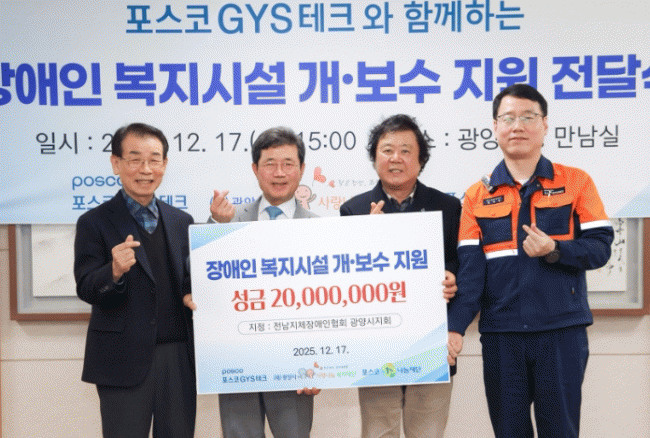 ±¤¾ç½Ã´Â Áö³ 17ÀÏ Æ÷½ºÄÚGYSÅ×Å©°¡ »çȸº¹Áö½Ã¼³ °³¡¤º¸¼ö¸¦ À§ÇÑ ÁöÁ¤±âŹ±Ý 2õ¸¸ ¿øÀ» Àü³²ÁöüÀå¾ÖÀÎÇùȸ ±¤¾ç½ÃÁöȸ¿¡ Àü´ÞÇß´Ù°í ¹àÇû´Ù.