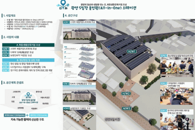 ¡®±¤¾çÀ¾ ¿ÀÀÏÀå ¿ÃÀοø ½ºÅ×À̼ǡ¯ »ç¾÷Àº ±¤¾çÀ¾ ¿øµµ½É¿¡ ÁÖÂ÷¡¤Ä¿¹Â´ÏƼ¡¤Ã»³ââ¾÷¡¤¹®È ±â´ÉÀ» °áÇÕÇÑ º¹ÇÕÄ¿¹Â´ÏƼ Ÿ¿ö¸¦ Á¶¼ºÇÏ´Â µµ½ÃÀç»ý »ç¾÷À¸·Î, ÇØ´ç Áö¿ªÀÇ »ó±Ç Ȱ¼ºÈ¿Í ÁֹΠ»îÀÇ Áú °³¼±À» ¸ñÇ¥·Î ÇÑ´Ù.