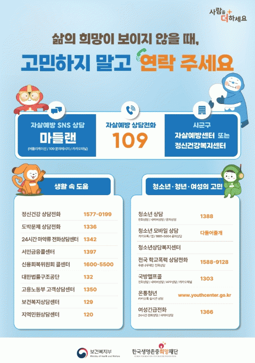 µµ¿òÀÌ ÇÊ¿äÇÑ °æ¿ì ´ã¾ç±º Á¤½Å°Ç°º¹Áö¼¾ÅÍ ¶Ç´Â ¿¹¹æ »ó´ã ÀüÈ(109)¸¦ ÅëÇØ ¾È³»¹ÞÀ» ¼ö ÀÖ´Ù.