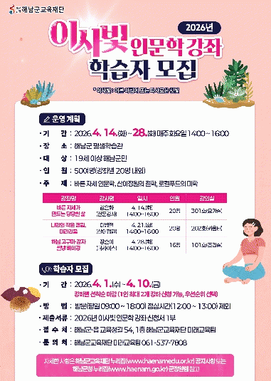 ÇØ³²±º±³À°Àç´ÜÀº 4¿ù 14ÀϺÎÅÍ 28ÀϱîÁö¡®Çس² ÀÌ»çºû Àι®ÇÐ °Á¡¯¸¦ ¿î¿µÇÑ´Ù.¡®ÀÌ»çºû¡¯Àº¡®À̸¥ ¾ÆÄ§ µû½ºÇÏ°Ô ºñÃß´Â ÇÞºû¡¯À» ÀǹÌÇÏ¸ç µû¶æÇϰí Ä£±ÙÇÑ Àι®ÇÐÀÇ ºûÀ» ÀüÇÏ´Â ±º¹Î ±³À°°úÁ¤ÀÌ´Ù.