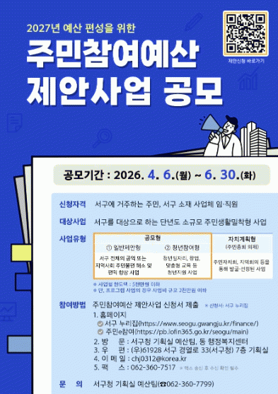 ±¤ÁÖ±¤¿ª½Ã ¼±¸°¡ ½ÇÁúÀûÀÎ ÁÖ¹ÎÁÖ±Ç °È¸¦ À§ÇØ ¡®ÁÖ¹ÎÂü¿©¿¹»ê Á¦¾È»ç¾÷ °ø¸ð¡¯¸¦ 6¿ù 30ÀϱîÁö ÁøÇàÇÑ´Ù. À̹ø °ø¸ð´Â ³»³âµµ ¿¹»ê¿¡ ¹Ý¿µÇÒ ÁֹΠÁ¦¾È»ç¾÷À» ¸ðÁýÇÏ´Â °ÍÀ¸·Î ÀÌ´Þ 6ÀϺÎÅÍ Á¢¼ö¸¦ ½ÃÀÛÇÑ´Ù.