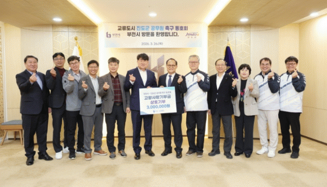 Áøµµ±º°ú ºÎõ½Ã°¡ Àڸŵµ½Ã °£ ±³·ù¸¦ Ȱ¼ºÈÇϱâ À§ÇØ ÃßÁøÇÑ ¡®Ã౸µ¿È£È¸ Ä£¼± ±³·ù Çà»ç¡¯¿¡¼ °íÇâ»ç¶û±âºÎ±Ý 300¸¸ ¿øÀ» »óÈ£ ±âºÎÇϸç, ¾ç ÁöÀÚü °£ÀÇ Çù·Â °ü°è¸¦ ÇÑÃþ °ÈÇß´Ù.