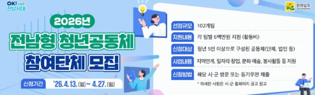 Àü¶ó³²µµ°¡ û³âÀÇ Áö¿ª Á¤Âø°ú Ȱµ¿ ±â¹Ý ¸¶·ÃÀ» À§ÇØ ¡®2026 Àü³²Çü û³â°øµ¿Ã¼ Ȱ¼ºÈ »ç¾÷¡¯¿¡ Âü¿©ÇÒ 102°³ ÆÀÀ» ¸ðÁýÇÑ´Ù.