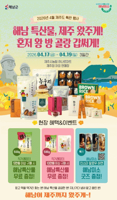 ÇØ³²±ºÀº ¹Ù´Ù °Ç³Ê Á¦ÁÖ ¼ÒºñÀÚ¸¦ ã¾Æ ¿À´Â 17ÀϺÎÅÍ 19ÀÏ, 3Àϰ£ Á¦ÁֽóóÇù Çϳª·Î¸¶Æ® Á¦ÁÖÁ¡ ¾ß¿ÜƯ¼³¸ÅÀå¿¡¼ ³ó¼öƯ»ê¹° Á÷°Å·¡ÀåÅ͸¦ ¿î¿µÇÑ´Ù. À̹ø Çà»ç¿¡¼´Â ÇØ³²°í±¸¸¶¸¦ ºñ·ÔÇØ Àâ°î·ù, Â÷·ù, °¡°ø½Äǰ µî 100¿©Á¾ÀÇ ´Ù¾çÇÑ ³ó¼öƯ»ê¹°À» ÇÕ¸®ÀûÀÎ °¡°ÝÀ¸·Î ¼±º¸ÀÏ ¿¹Á¤ÀÌ´Ù.