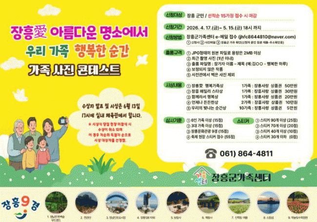 ÀåÈﱺ°¡Á·¼¾ÅÍ´Â Áö¿ªÀÇ ¾Æ¸§´Ù¿î ¸í¼Ò¸¦ ¹è°æÀ¸·Î °¡Á·ÀÇ ¼ÒÁßÇÑ ¼ø°£À» ±â·ÏÇÏ´Â ¡®°¡Á·»çÁø ÄÜÅ×½ºÆ®¡¯¸¦ °³ÃÖÇÑ´Ù°í ¹àÇû´Ù.