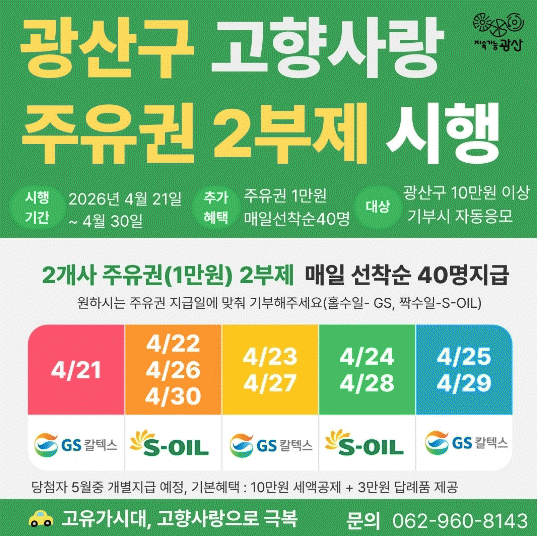 ÁÖÀ¯±Ç 2ºÎÁ¦ Çà»ç´Â ±¤»ê±¸¿¡ 10¸¸ ¿ø ÀÌ»ó ±âºÎÇÑ ±âºÎÀÚ¸¦ ´ë»óÀ¸·Î ¸ÅÀÏ 40¸í¿¡°Ô ¼±Âø¼øÀ¸·Î ÁÖÀ¯±Ç 1¸¸ ¿øÀ» Áö±ÞÇÑ´Ù.
