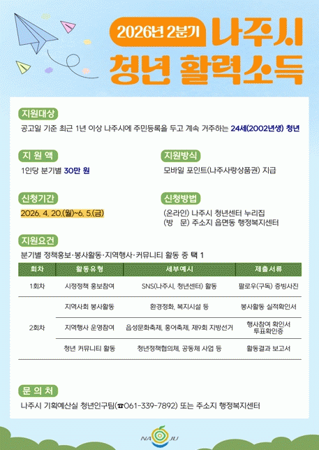 Àü³² ³ªÁֽð¡ Áö¿ª û³âÀÇ »çȸÂü¿© È®´ë¿Í ¾ÈÁ¤Àû Á¤ÂøÀ» Áö¿øÇϱâ À§ÇØ °ø°øÈ°µ¿ Âü¿©¸¦ Á¶°ÇÀ¸·Î ºÐ±âº° 30¸¸ ¿øÀ» Áö±ÞÇÏ´Â ¡®Ã»³â Ȱ·Â¼Òµæ Áö¿ø»ç¾÷¡¯ 2ºÐ±â Âü¿©ÀÚ ¸ðÁý¿¡ ³ª¼±´Ù.