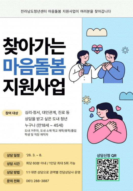 Àü¶ó³²µµ°¡ Áö¿ª û³âÀÇ ½É¸®Àû¡¤Á¤¼Àû ¾ÈÁ¤°ú °Ç°ÇÑ »çȸÂü¿©¸¦ Áö¿øÇϱâ À§ÇØ ¡®2026³â û³â ¸¶À½Ä¡À¯ ÇÁ·Î±×·¥¡¯À» ½Ã¹ü ÃßÁøÇÑ´Ù.