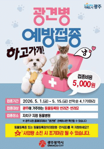 ±¤ÁÖ±¤¿ª½Ã´Â ¹Ý·Áµ¿¹°°ú ½Ã¹ÎÀÇ °Ç°À» Áö۱â À§ÇØ 5¿ù 1ÀϺÎÅÍ 15ÀϱîÁö ¡®º½Ã¶ ±¤°ßº´ ¿¹¹æÁ¢Á¾ »ç¾÷¡¯À» ÃßÁøÇÑ´Ù.