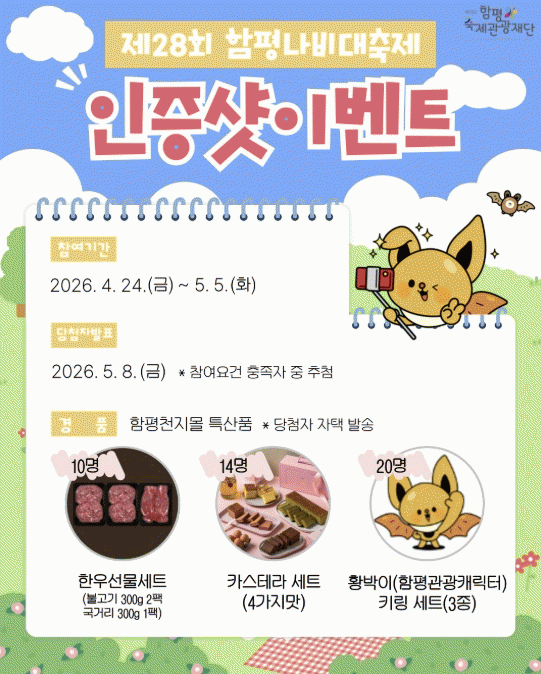À̺¥Æ®´Â ÃàÁ¦ °³¸·ÀÏÀÎ ¿À´Â 24ÀϺÎÅÍ 5¿ù 5ÀϱîÁö ÃàÁ¦ ±â°£ ÁøÇàÇϸç, Ãß÷À» ÅëÇØ ÃÑ 44¸í¿¡°Ô °æÇ°À» Á¦°øÇÑ´Ù. °æÇ°À¸·Î´Â ÇÔÆòõÁö¸ô »óǰ°ú ÇÔÆò °ü±¤ ij¸¯ÅÍ ¡®È²¹ÚÀÌ¡¯ ¿¼è°í¸® µîÀÌ ÁغñµÅ ÀÖ´Ù.